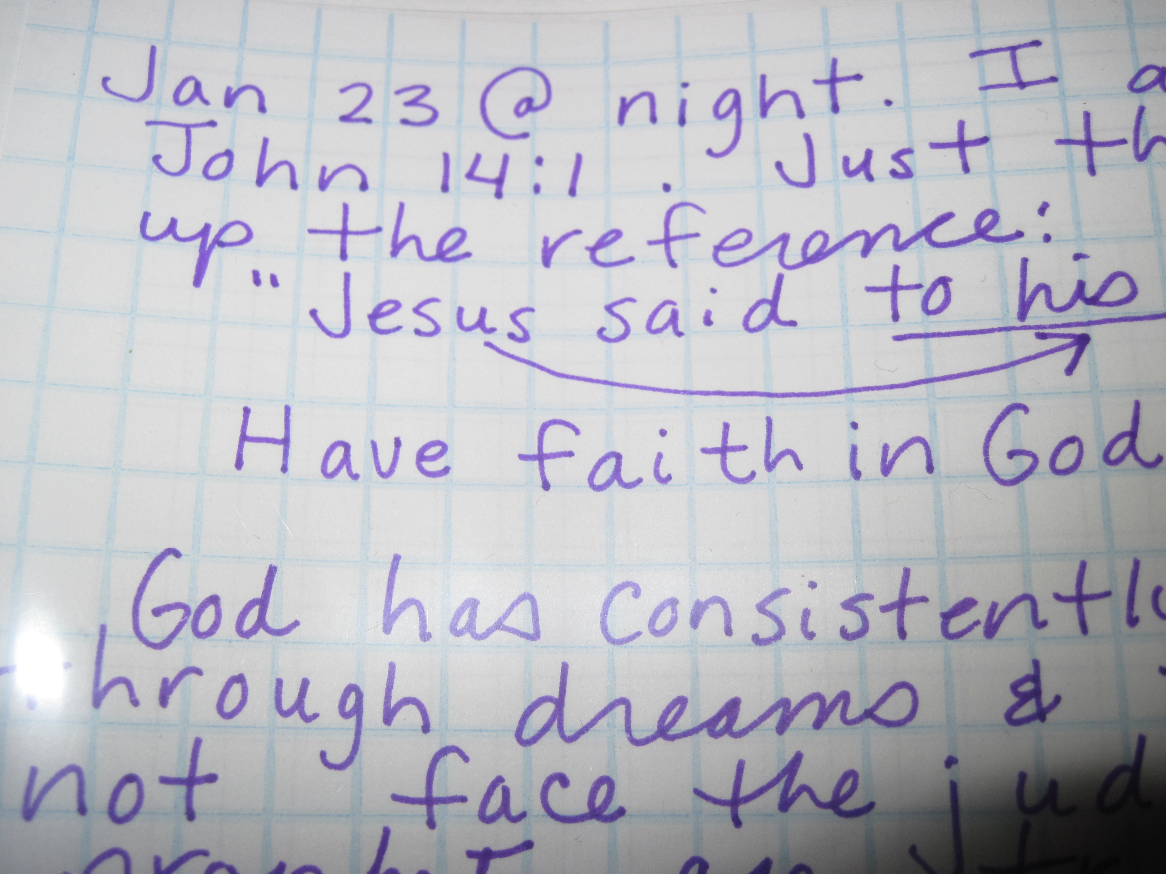 IMG_0172If Holy Spirit graciously chose a verse to speak to you in the middle of the night, January 23rd, would you wake up and pull out your Bible to investigate? I Heard “John 14:1” clearly. Just that. Since God’s words are the same yesterday, today and tomorrow, He uses them to exhort or encourage us today as well. Their message is timeless. “The Lord told me to write down his message for his people, so that it would be there forever.” (Isaiah 30:8) I have been reading many prophetic pronouncements of judgement coming to America, which can up one’s fear factor. The idea of national betrayal, food shortages, martial law — the changing of that which has always been solidly assured by our U.S. Constitution and God’s spirit of patriotism — can bring the fear of uncertainty.